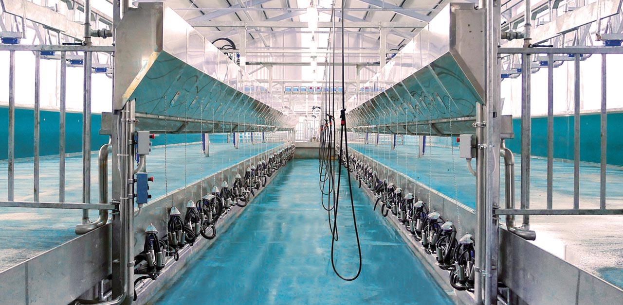Rear milking parlour, ideal for livestocks of big dimensions. Animals are disposed side by side at 90° in comparison to the milk hole outline and separated by appropriate gates installed on the breast rail.