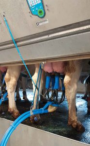 In our milking parlour we faced also the delicate problem concerning the positioning of the cluster in installations with rear milking. With the rope and pulley system we can sustain the weight of the long milk tube and also the pulsation tube, without binding them at the pit edge. The operator will set the length of the rope according to the udder shape ensuring an excellent balance of the cluster in order to avoid the overmilking of the anterior quarter (udder quarter)