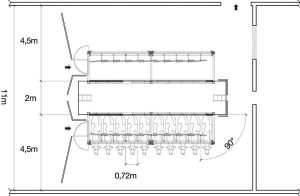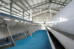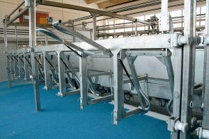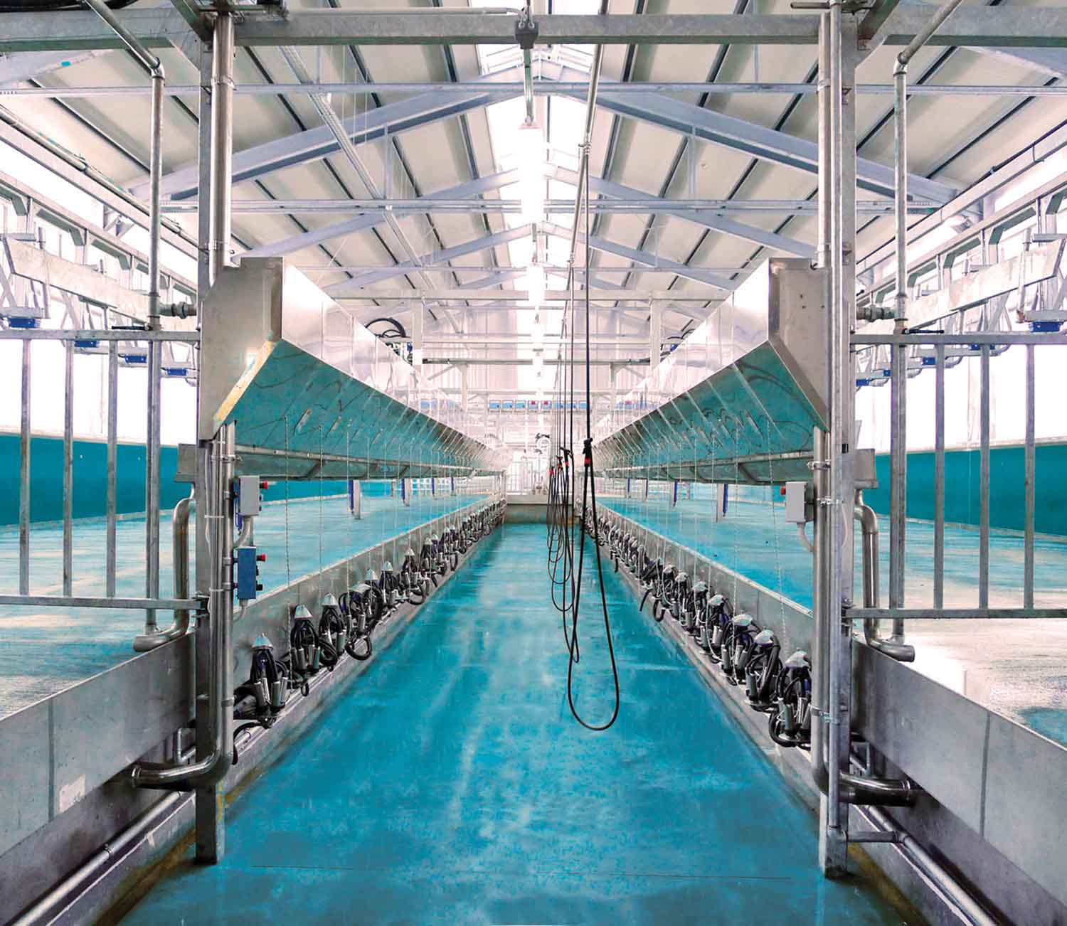 Rear milking parlour, ideal for livestocks of big dimensions. Animals are disposed side by side at 90° in comparison to the milk hole outline and separated by appropriate gates installed on the breast rail.