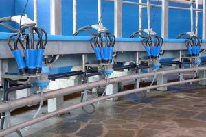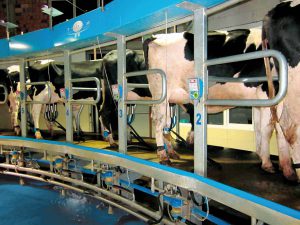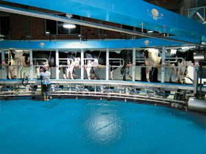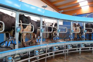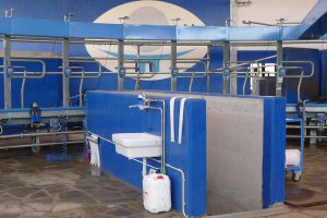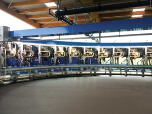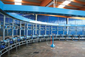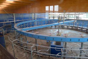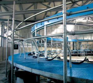 The rotary milking parlour with internal milking is designed for the herringbone positioning of the animals with an angle of 30°. The visibility of the udder and the worker comfort during the joint phase are those typical of the traditional herringbone milking parlour. The cage is installed on a metal platform covered by a cement floor. The rotation is made through teflon wheels activated by geared motors. This type of milking parlour do not need a hole for the milking because the animals are positioned above the working level of the operators.